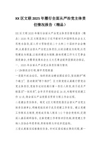 XX区委关于2025年落实全面从严治党主体责任的情况