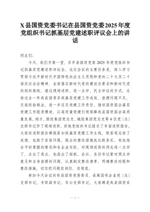 XX县国资党委书记在县国资党委2025年度党组织书记抓基层党建述职评议会上的讲话
