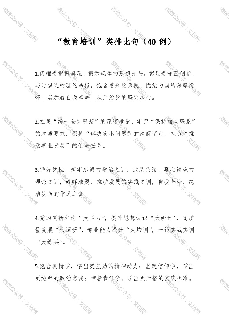 微信公众号微信公众号微微信公众号:文档网微信公众号:文档网“教育培训”类排比句(40例)微信公众号:文档网微信1.闪耀着把握真理、揭示规律的思想光芒,彰显着守正创新、与时俱进的理论品格,饱含着兴党为民、忧党为国的深厚,展示着自我革命、从严治党的坚定决心。当网微信公众号2.立足“统二全党思想”的深邃考量,牢记“保持血肉联系”微信的本质要求,保持“解决突出问题”的清醒坚定,担负“推小事业发展”的使命任文档网文档网3锤炼党性、筑牢忠诚的政治之训,武装头脑、凝心铸魂的微信公众号:文档网理论之训,破解难题、推动发展的实践之训,自我革命、纯洁队伍的作风之抛兴文档网:文档网4.党的创新理论“大学习”,提升思想认识“大研讨”,高质微信公众号:文档网量发展“大调研”,专业能力提升“大培训”,一线实战实训信“大练兵”公众号:文档网公众号公众号文档网文档网5.饱含真情学,学出更强劲的精神动力;坚定信仰学,学出更纯粹的政治忠诚;带着责任学,学出更严格的实践标准。微信公众号:文档网信公众号:文档网信公众号:文档网