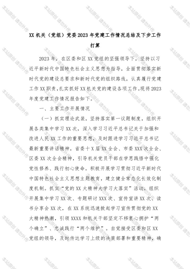 本站原创请勿外传本站原创请勿外传本站原创请勿外传本站原创请勿外传本站原创请勿双机关(党组)党委2023年党建工作情况总结及下步工作打算本站原创请勿外传本站本站2023年,,在区委和区Xx党组的坚强领导下,坚持以习平新时代中国特色社会主义思想为指导,全面贯彻落实新时代党的建设总要求和新时代党的组织路线,认真履行党建工作XX职责,扎实抓好XX机关党的建设各项工作。现将2023本站原创请勿外传一、主要王作开展情况站原创请勿外传本站原创请勿(一)抓实理论武装,坚持落实第一议题制度,组织开展各类集中学习XX次,深入学习习近平总书记关于加强和改进人民X工作的重要思想,及时跟进学习习近平总书记最新重要讲话精神,省委十X届x全会、市委XXX次全会、党性修养、践行初心使命。积极开展学习贯彻习近平新时代本站原创请勿外中国特色社会主义思想主题教育,建立健全常态化长效化制度机制。抓实“党的XX大精神大学习大落实”活动,组织本站原创请开展集中学习XX次、专题研讨XXX次、宣传宣讲XX次餐读书分享会XX次,在XX系统迅速掀起学习宣传贯彻党的XX本站原创请勿外传大精神热潮,引领XXXX和机关干部坚定不移衷心拥护“两个确立”、忠诚践行“两个维护”。自觉接受区委和区XX本站原创请勿组的领导,及时传达学习上级的决策部署和重要精神,确本站原本站原本站原