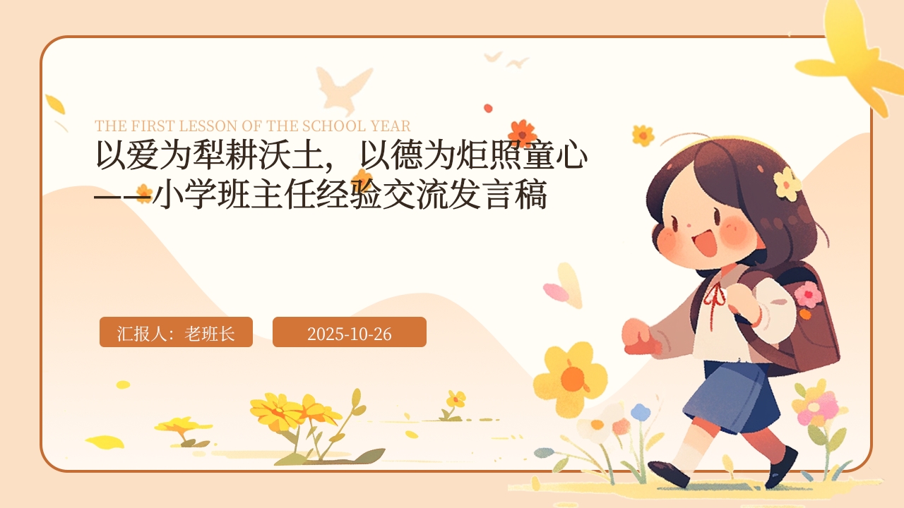首页PPT模板小学班主任经验交流发言稿:以爱为犁耕沃土,以德为炬照童心