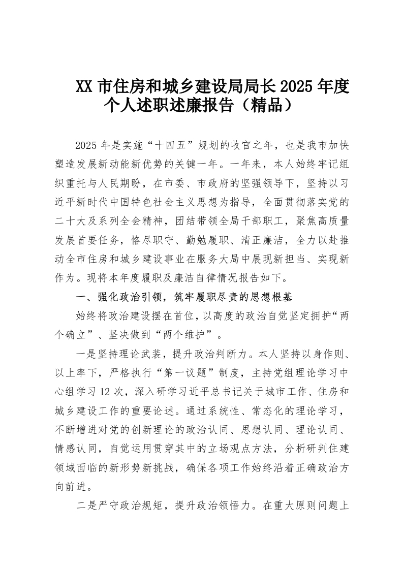 首页精选范文XX市住房和城乡建设局局长2025年度个人述职述廉报告(精品)