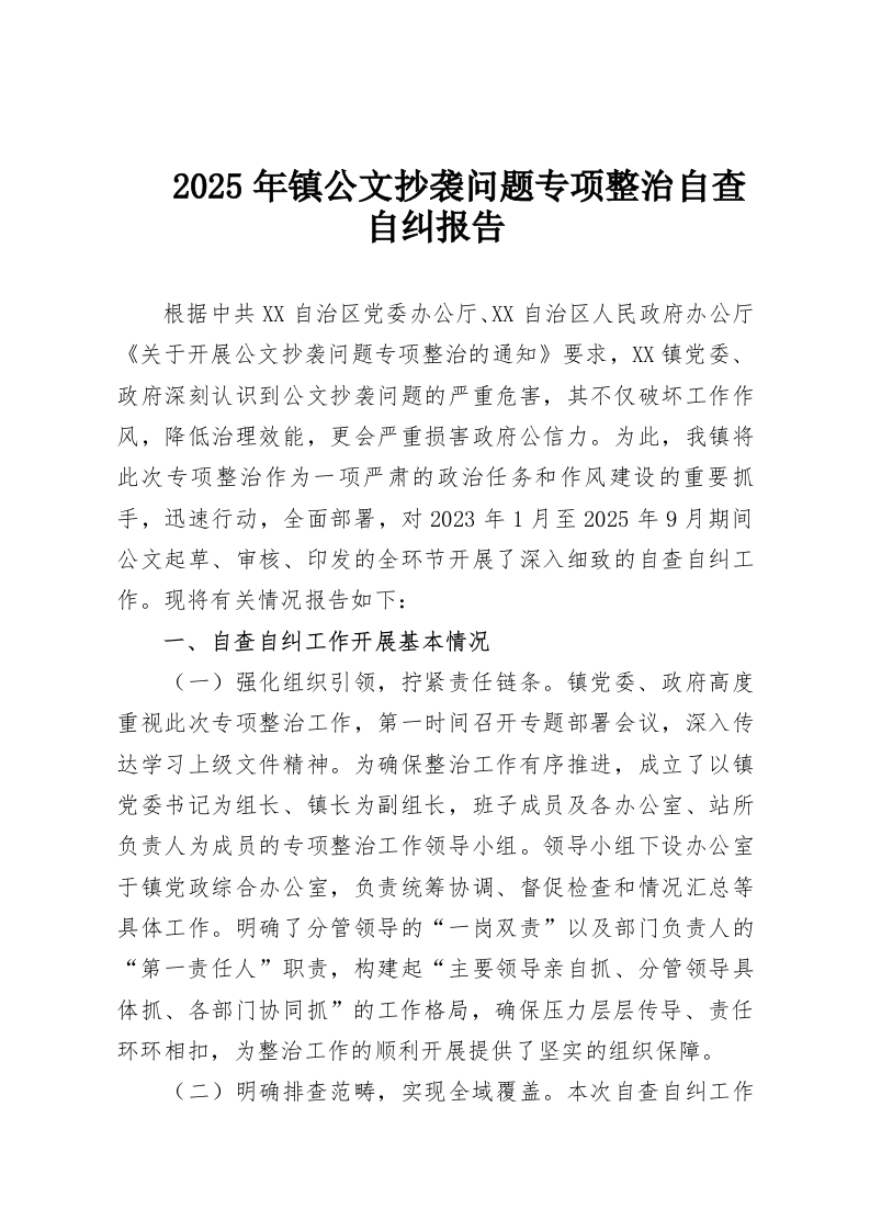 2025年镇公文抄袭问题专项整治自查自纠报告