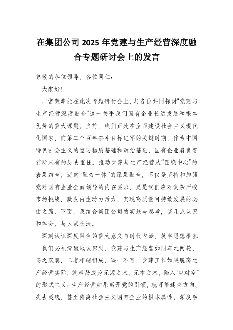 在集团公司2025年党建与生产经营深度融合专题研讨会上的发言