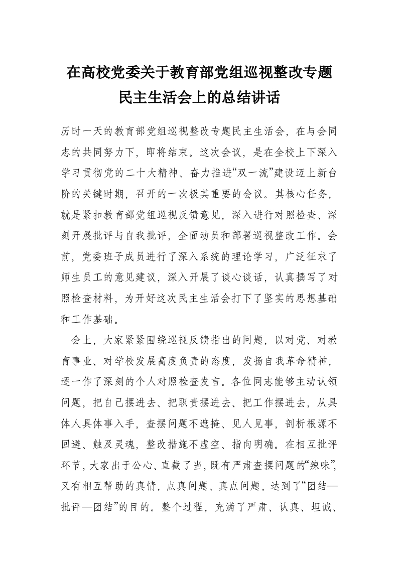 在高校党委关于教育部党组巡视整改专题民主生活会上的总结讲话