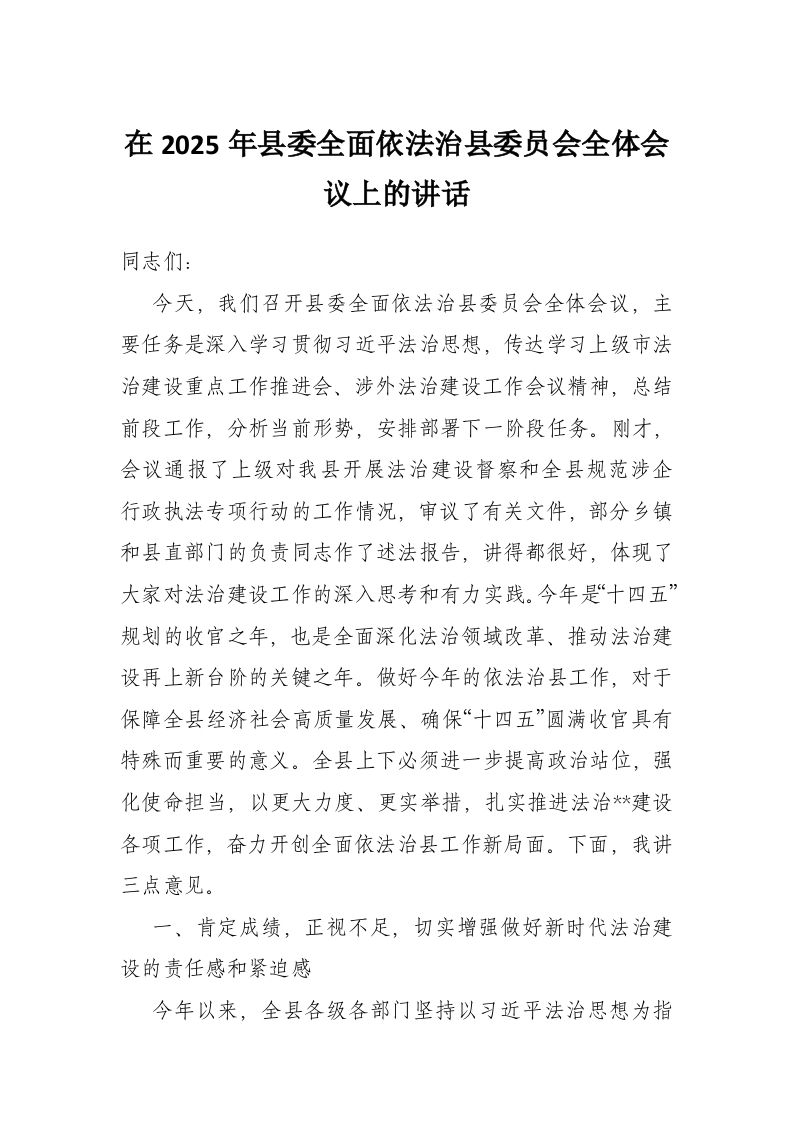 在2025年县委全面依法治县委员会全体会议上的讲话