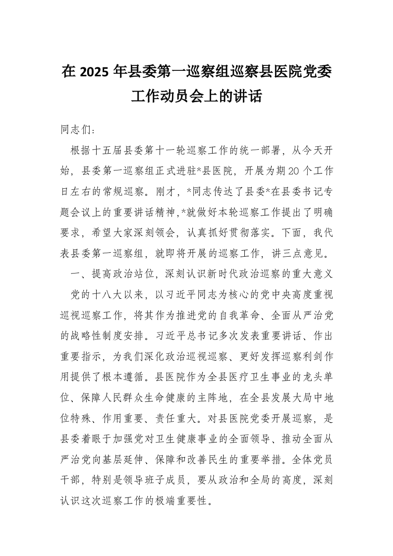 在2025年县委第一巡察组巡察县医院党委工作动员会上的讲话
