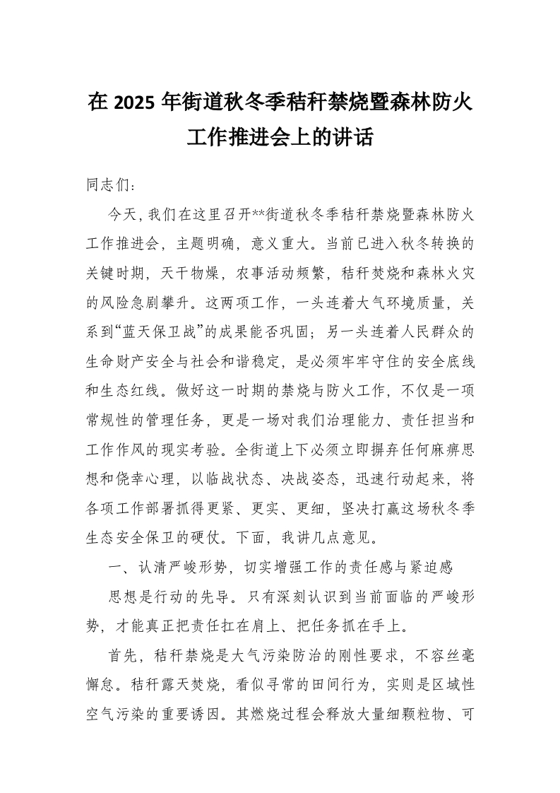 在2025年街道秋冬季秸秆禁烧暨森林防火工作推进会上的讲话