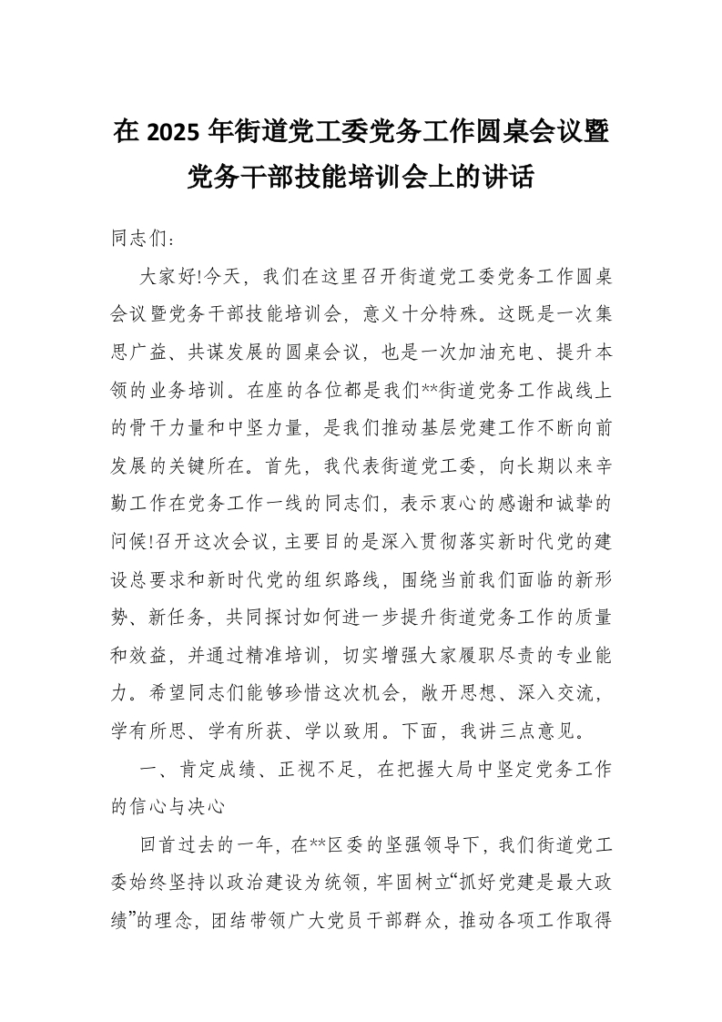 在2025年街道党工委党务工作圆桌会议暨党务干部技能培训会上的讲话