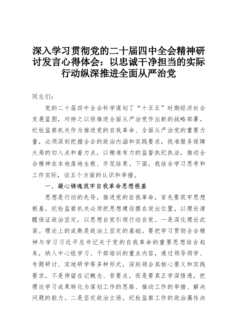 深入学习贯彻党的二十届四中***精神研讨发言心得体会:以忠诚干净担当的实际行动纵深推进全面从严治党