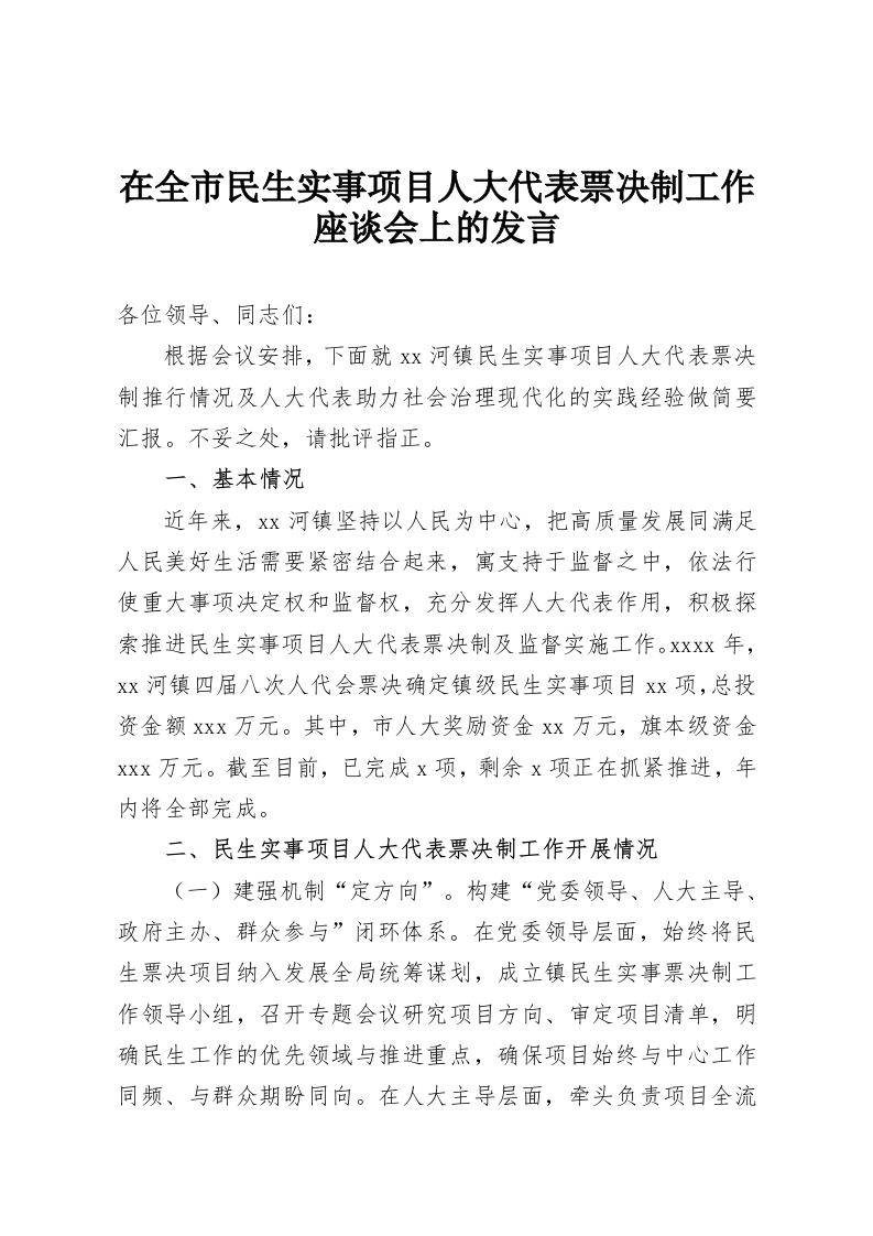 在全市民生实事项目人大代表票决制工作座谈会上的发言