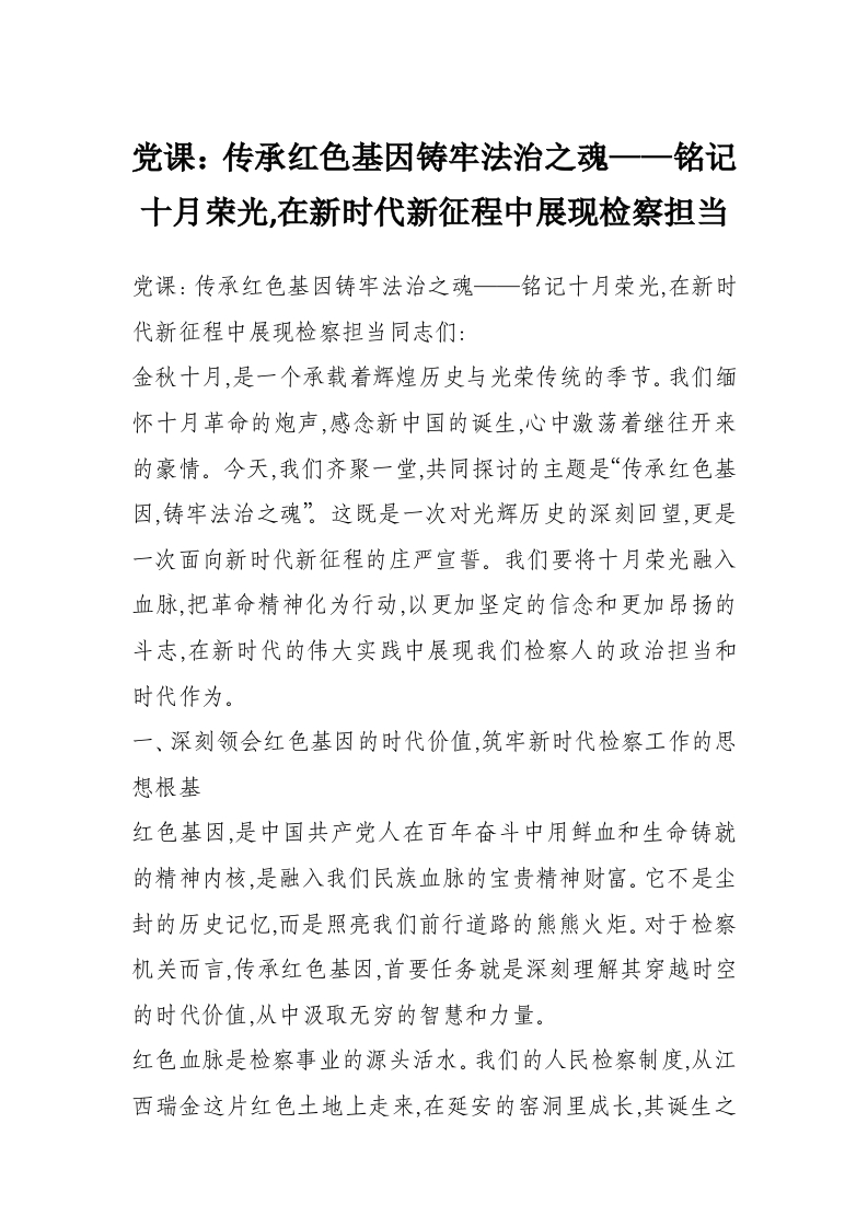 党课:传承红色基因铸牢法治之魂——铭记十月荣光,在新时代新征程中展现检察担当
