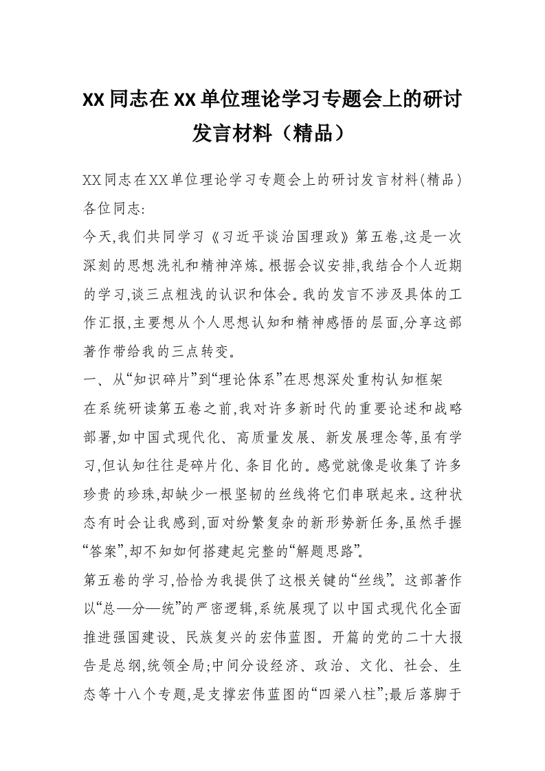 XX同志在XX单位理论学习专题会上的研讨发言材料(精品)