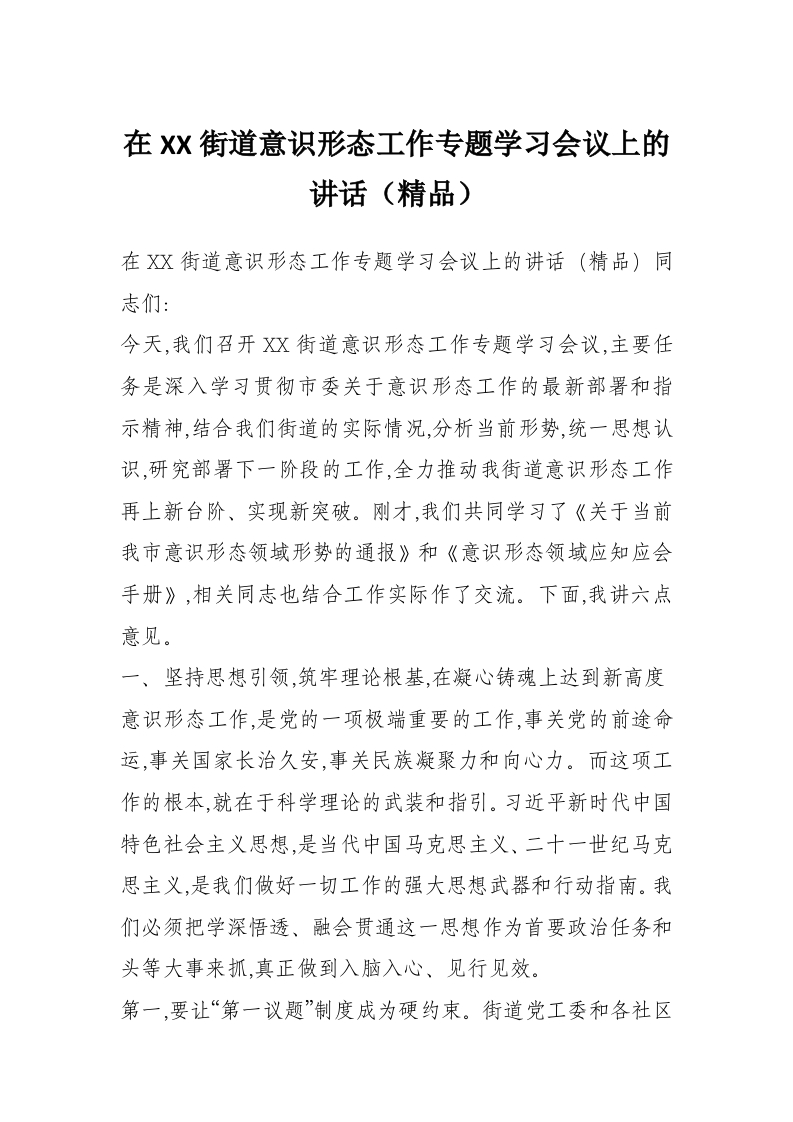 首页材料汇编在XX街道意识形态工作专题学习会议上的讲话(精品)