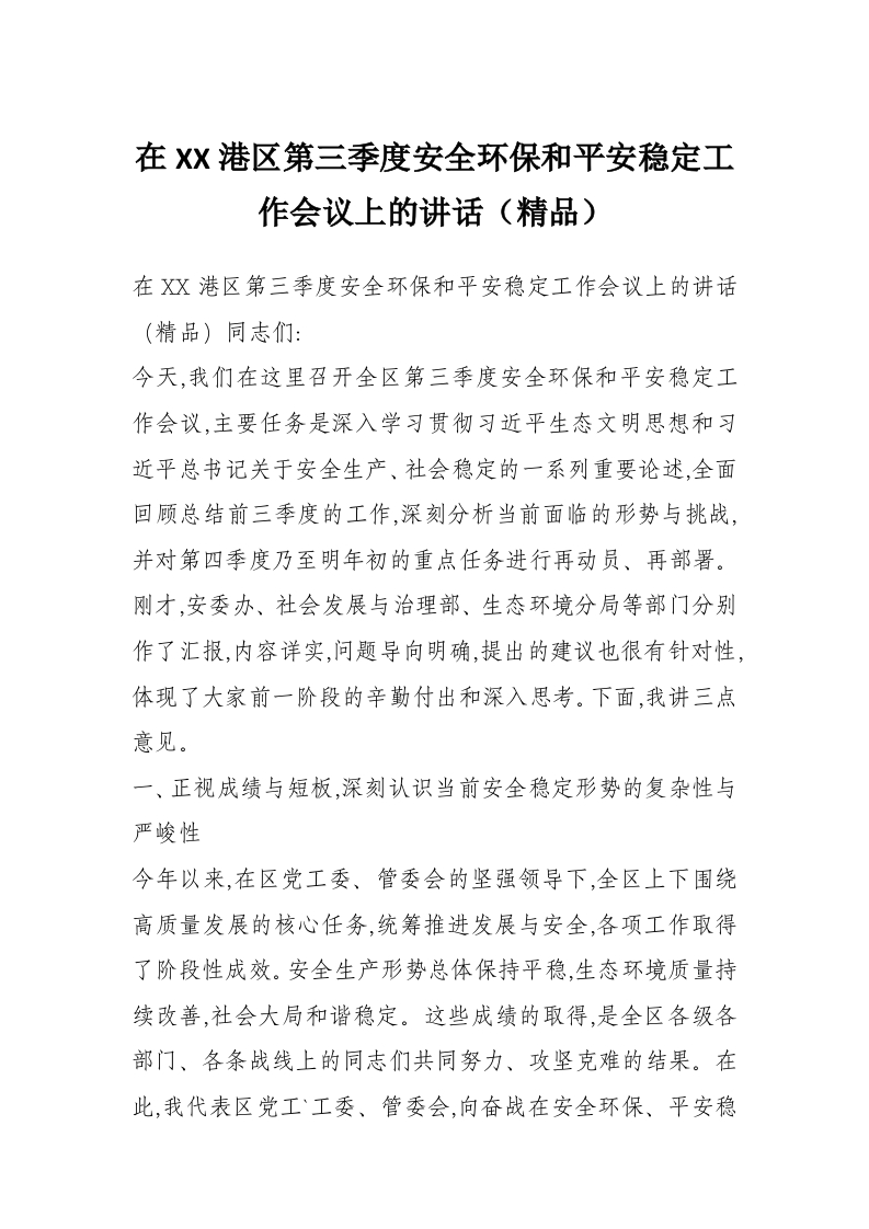在XX港区第三季度安全环保和平安稳定工作会议上的讲话(精品)