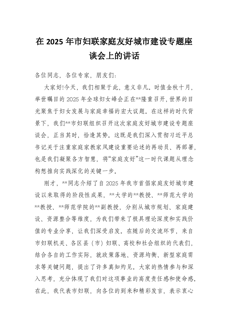 在2025年市妇联家庭友好城市建设专题座谈会上的讲话