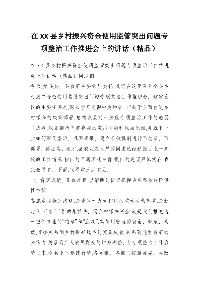 在XX县乡村振兴资金使用监管突出问题专项整治工作推进会上的讲话(精品)
