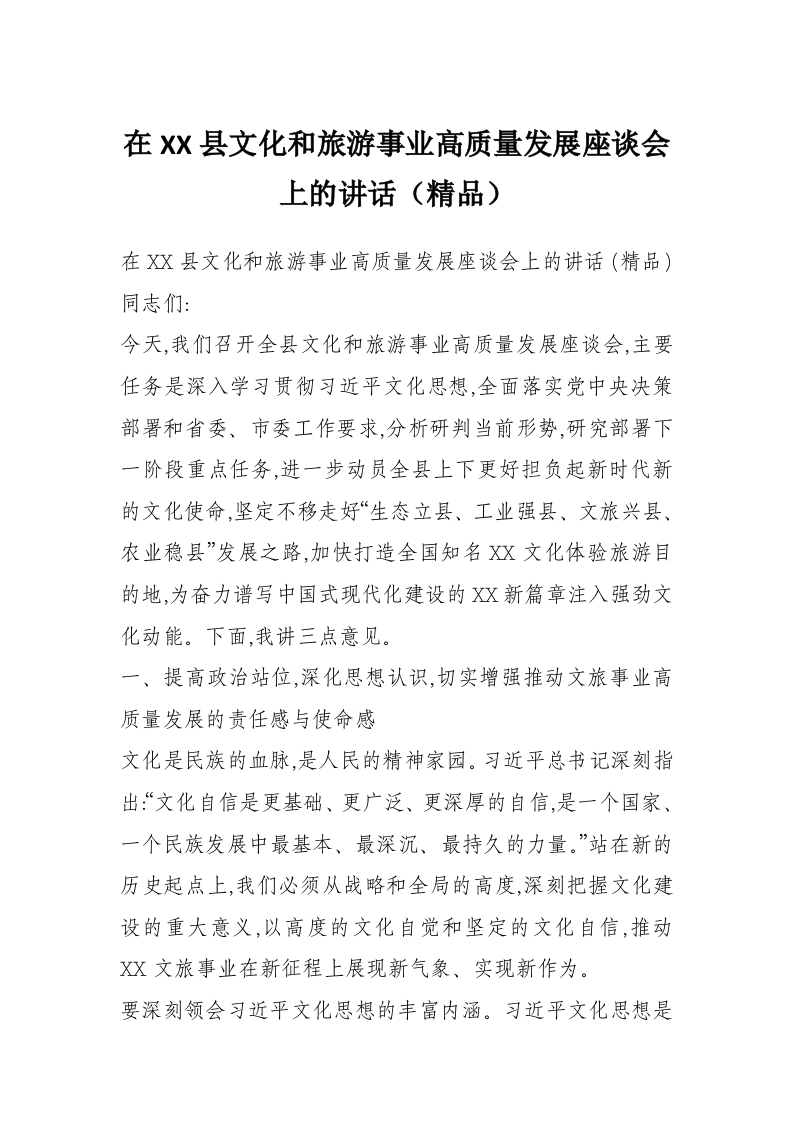 在XX县文化和旅游事业高质量发展座谈会上的讲话(精品)