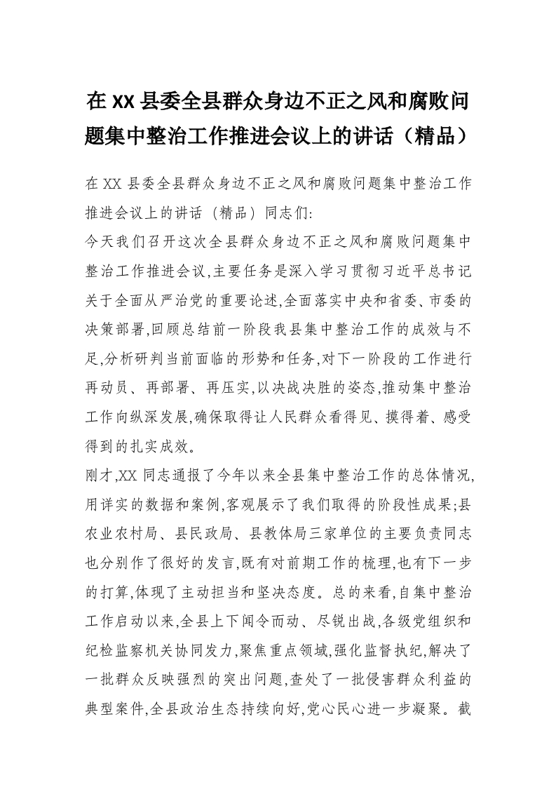 在XX县委全县群众身边不正之风和腐败问题集中整治工作推进会议上的讲话(精品)
