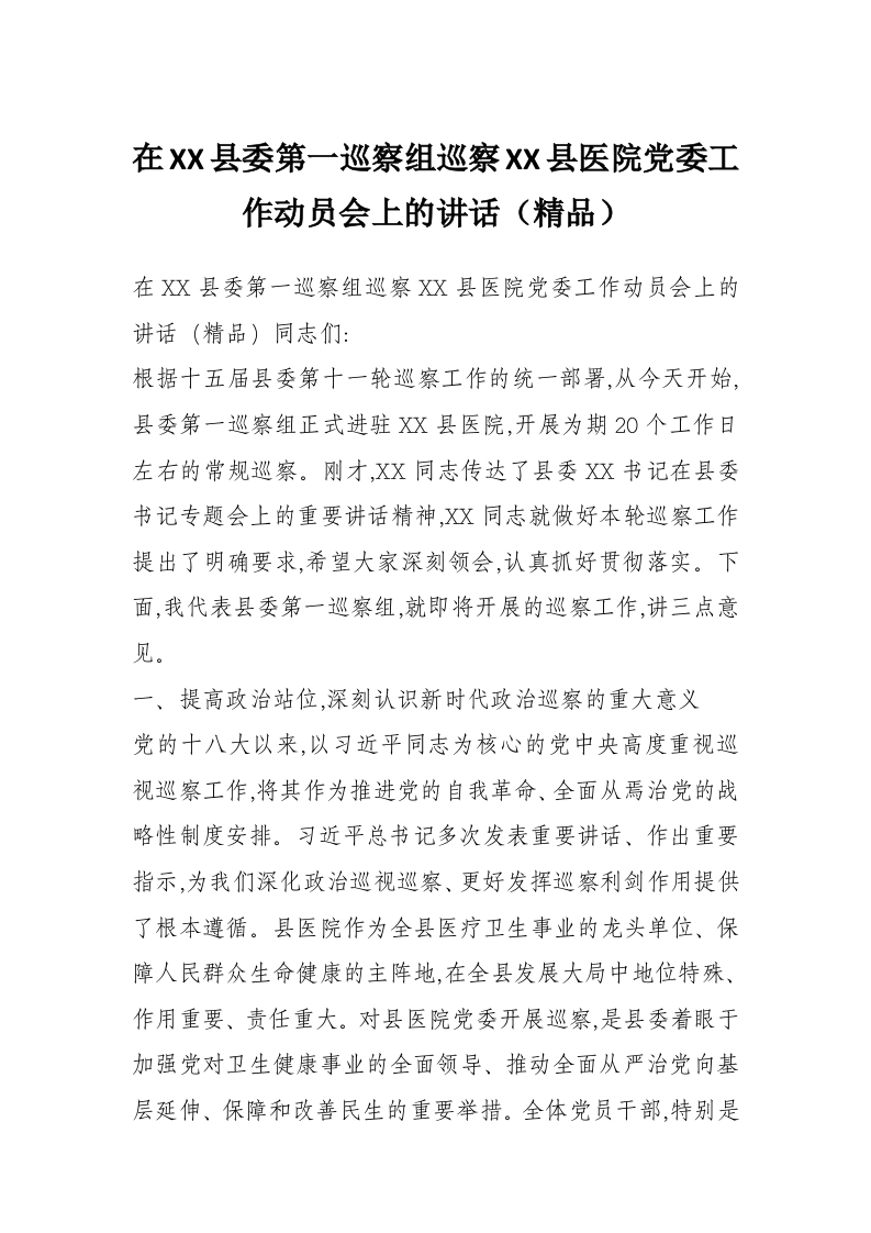 在XX县委第一巡察组巡察XX县医院党委工作动员会上的讲话(精品)