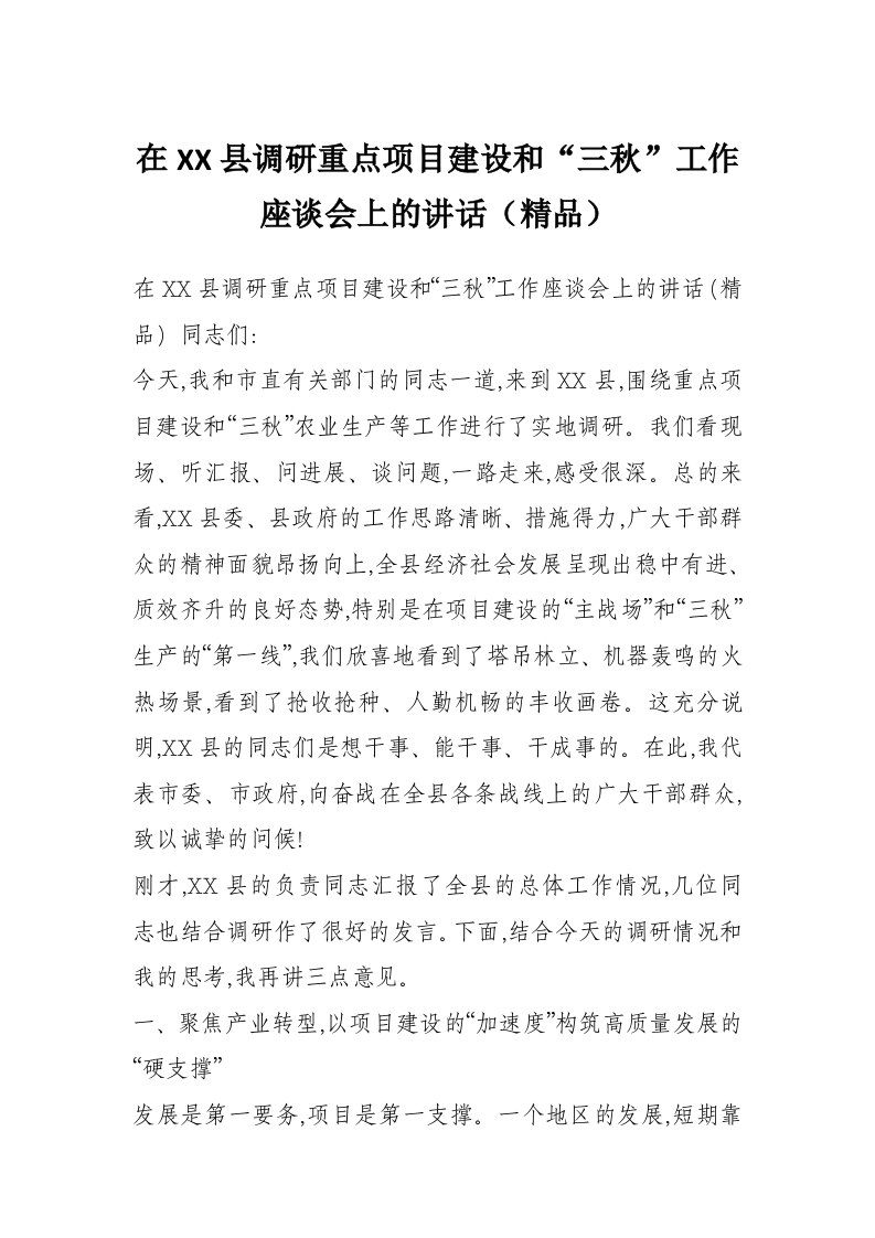 在XX县调研重点项目建设和“三秋”工作座谈会上的讲话(精品)