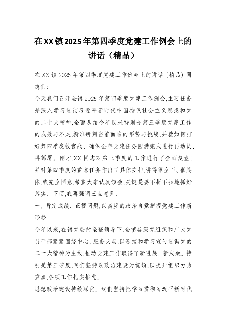 在XX镇2025年第四季度党建工作例会上的讲话(精品)
