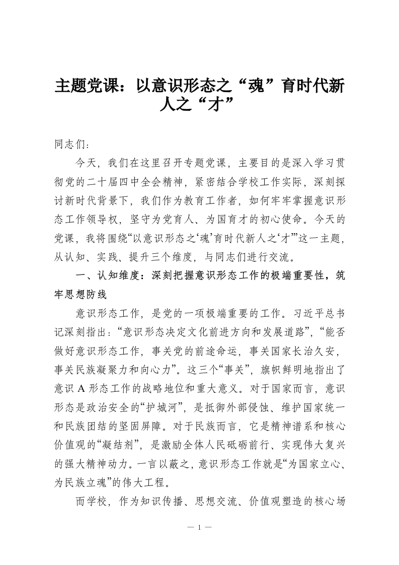 主题党课:以意识形态之“魂”育时代新人之“才”