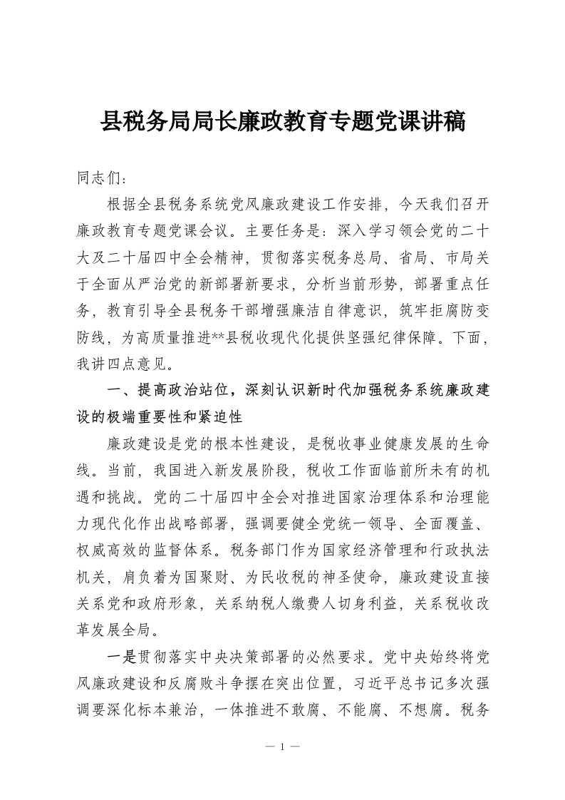 县税务局局长廉政教育专题党课讲稿