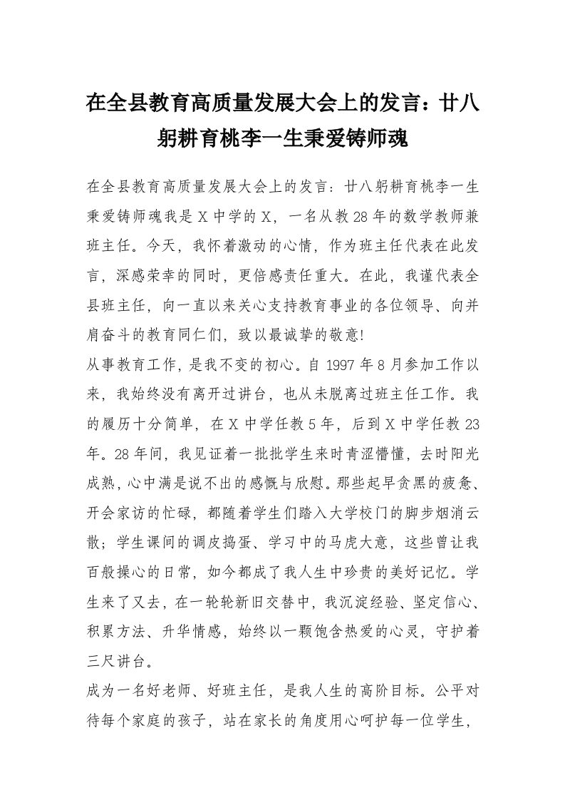 在全县教育高质量发展大会上的发言:廿八躬耕育桃李一生秉爱铸师魂