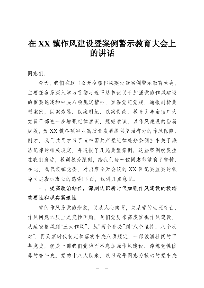 在XX镇作风建设暨案例警示教育大会上的讲话