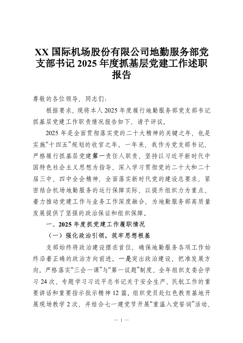 首页写作素材XX国际机场股份有限公司地勤服务部党支部书记2025年度抓基层党建工作述职报告