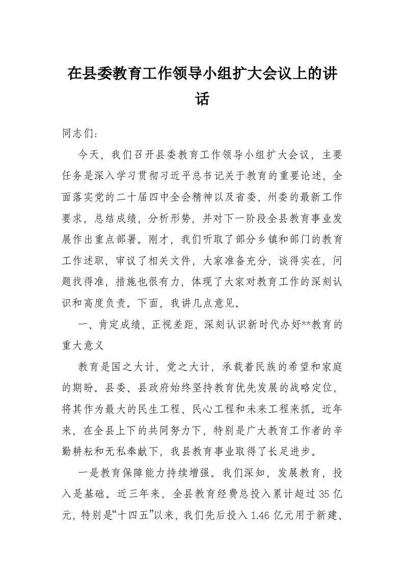 在县委教育工作领导小组扩大会议上的讲话