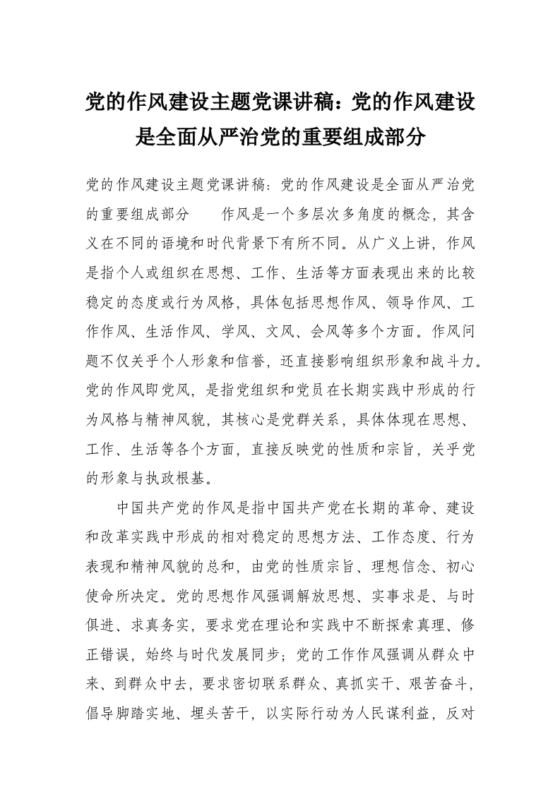 党的作风建设主题党课讲稿:党的作风建设是全面从严治党的重要组成部分