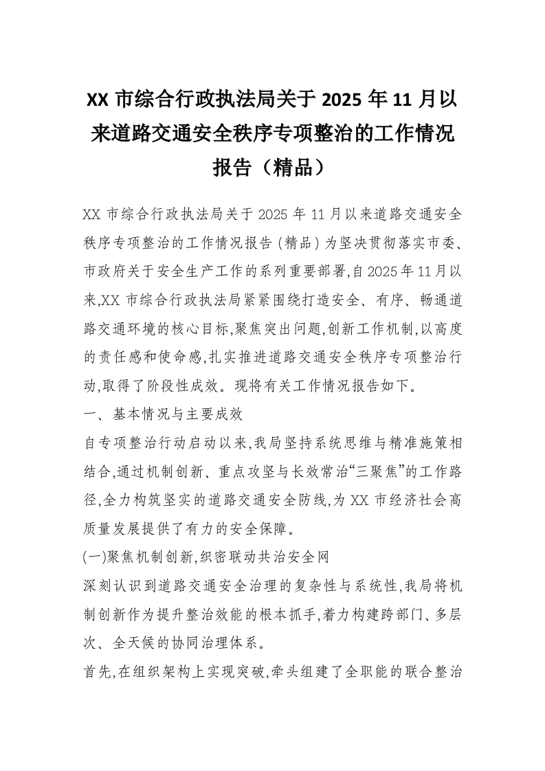 XX市综合行政执法局关于2025年11月以来道路交通安全秩序专项整治的工作情况报告(精品)