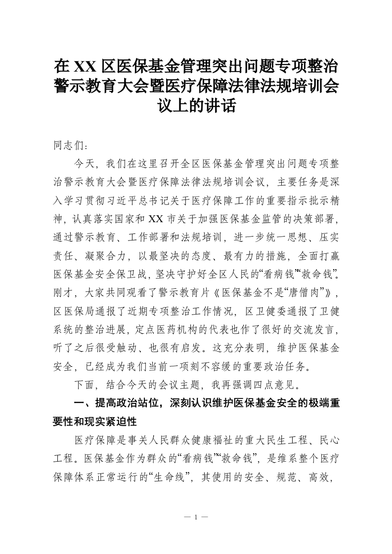 在XX区医保基金管理突出问题专项整治警示教育大会暨医疗保障法律法规培训会议上的讲话