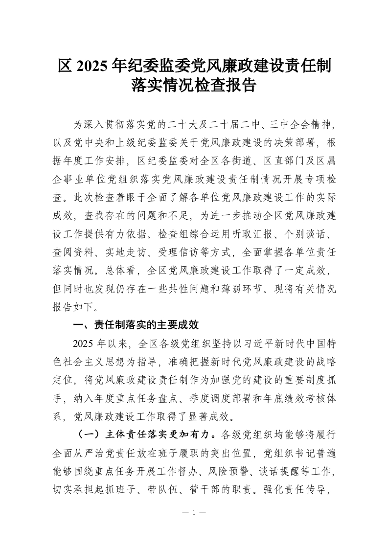区2025年纪委监委党风廉政建设责任制落实情况检查报告