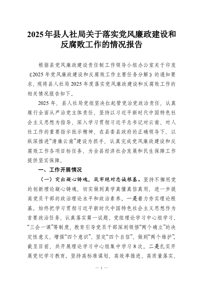 2025年县人社局关于落实党风廉政建设和反腐败工作的情况报告
