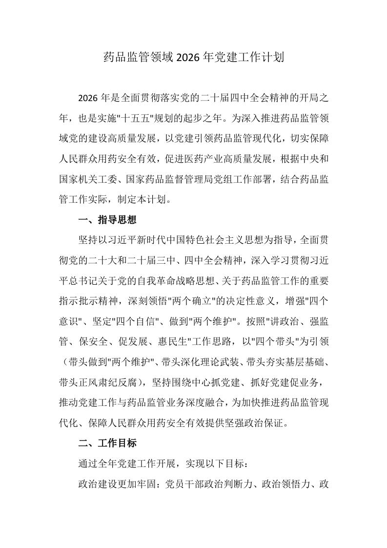 药品监管领域2026年党建工作计划