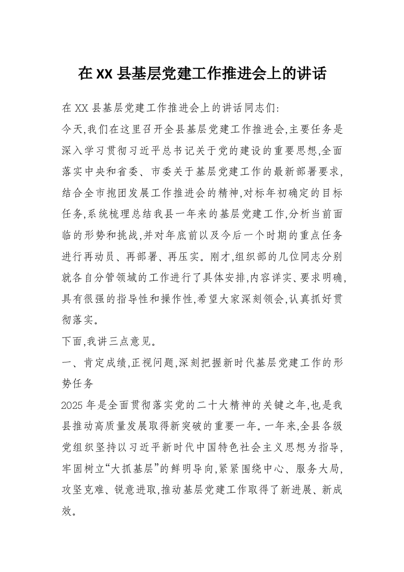 在XX县基层党建工作推进会上的讲话