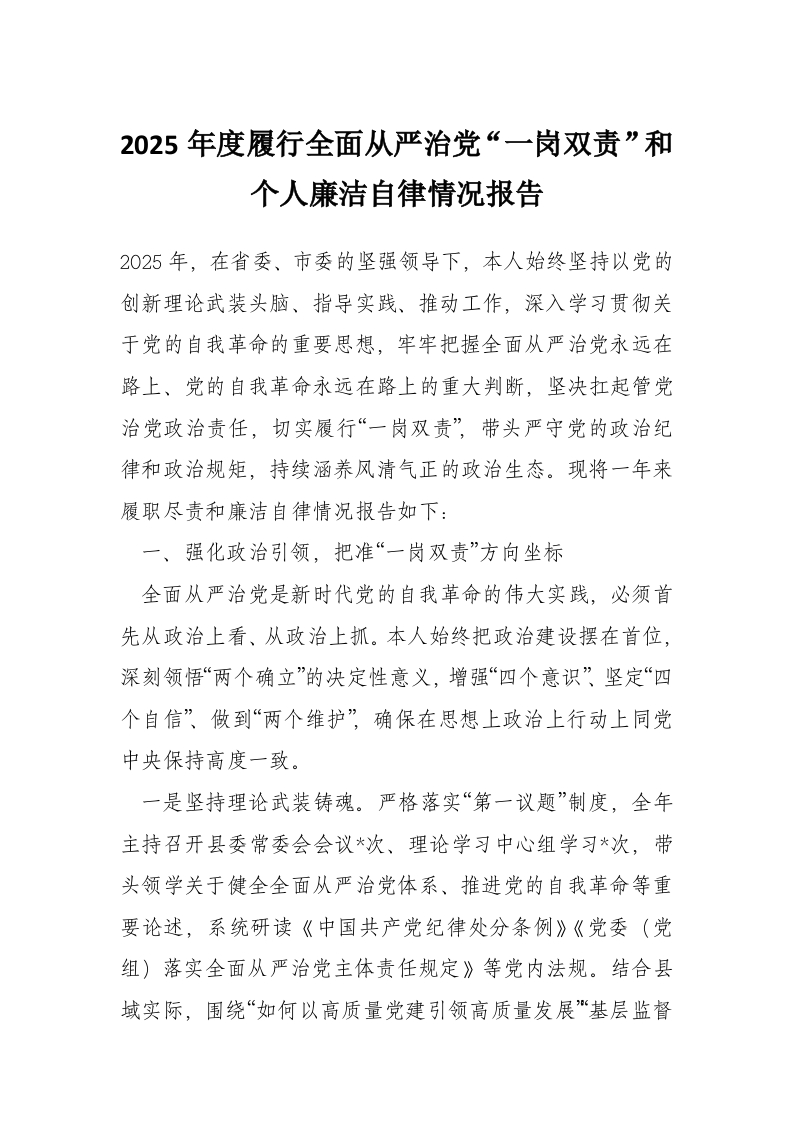 2025年度履行全面从严治党“一岗双责”和个人廉洁自律情况报告
