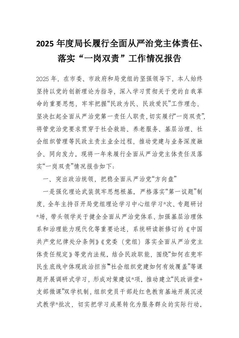 2025年度局长履行全面从严治党主体责任、落实“一岗双责”工作情况报告