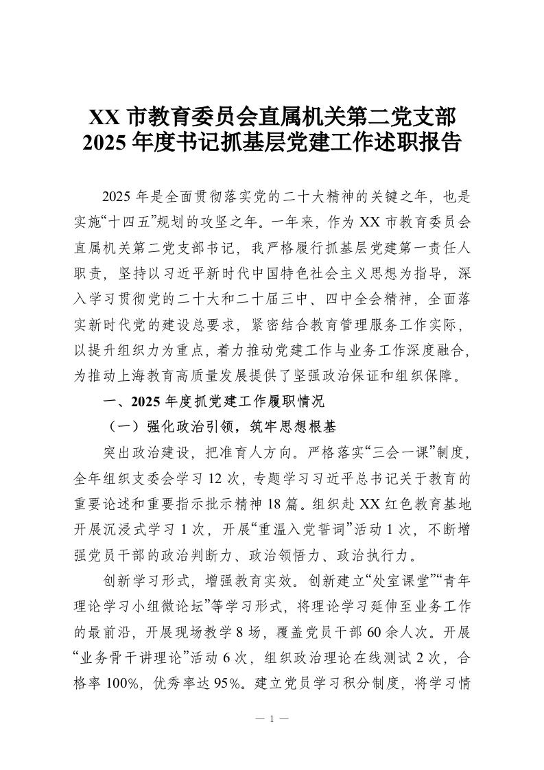 XX市教育委员会直属机关第二党支部2025年度书记抓基层党建工作述职报告