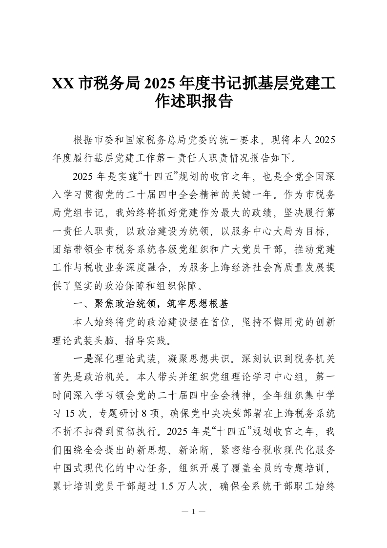 XX市税务局2025年度书记抓基层党建工作述职报告