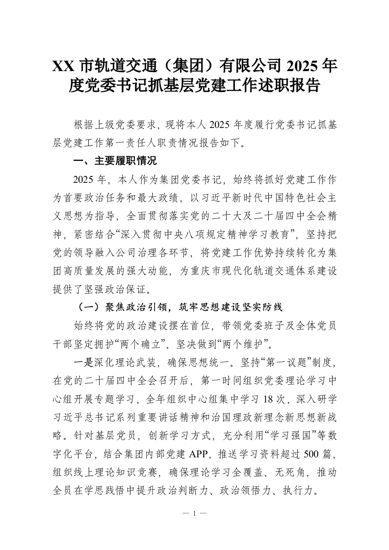 首页工作文档XX市轨道交通(集团)有限公司2025年度党委书记抓基层党建工作述职报告