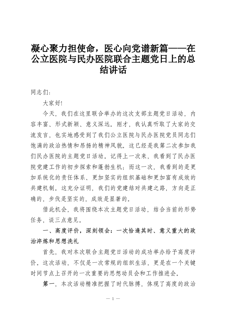 凝心聚力担使命,医心向党谱新篇——在公立医院与民办医院联合主题党日上的总结讲话