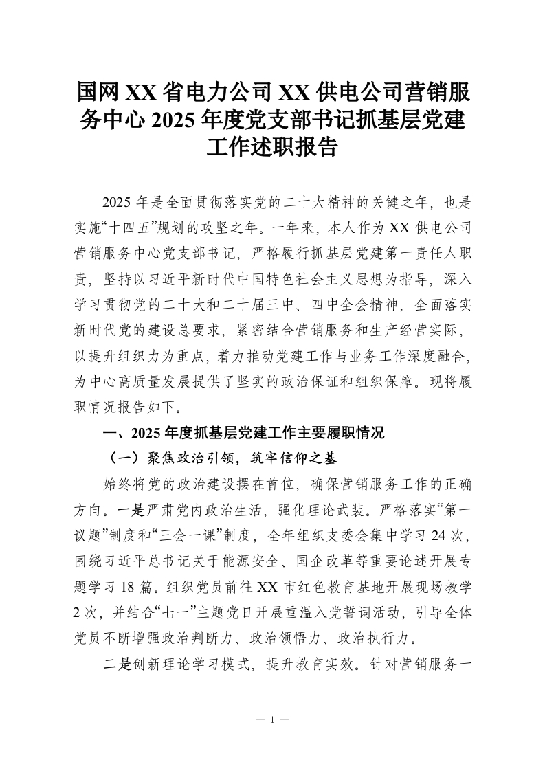 首页工作文档国网XX省电力公司XX供电公司营销服务中心2025年度党支部书记抓基层党建工作述职报告
