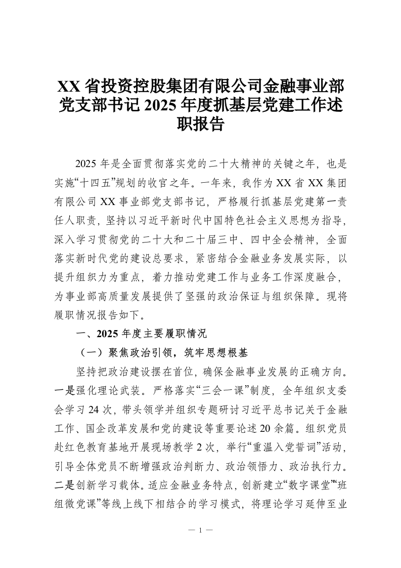 XX省投资控股集团有限公司金融事业部党支部书记2025年度抓基层党建工作述职报告