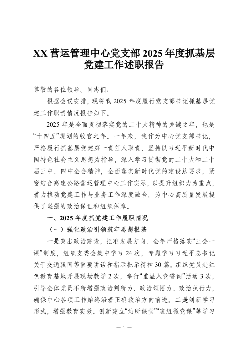 XX营运管理中心党支部2025年度抓基层党建工作述职报告