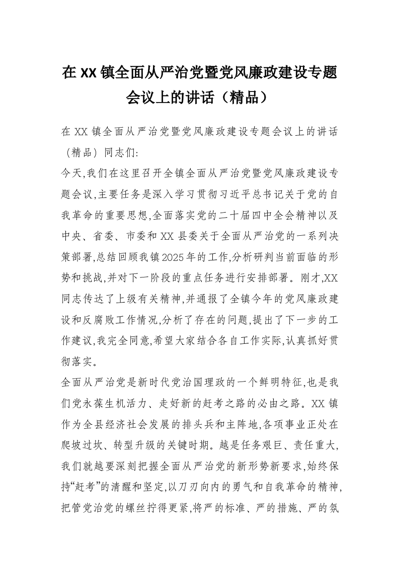 在XX镇全面从严治党暨党风廉政建设专题会议上的讲话(精品)