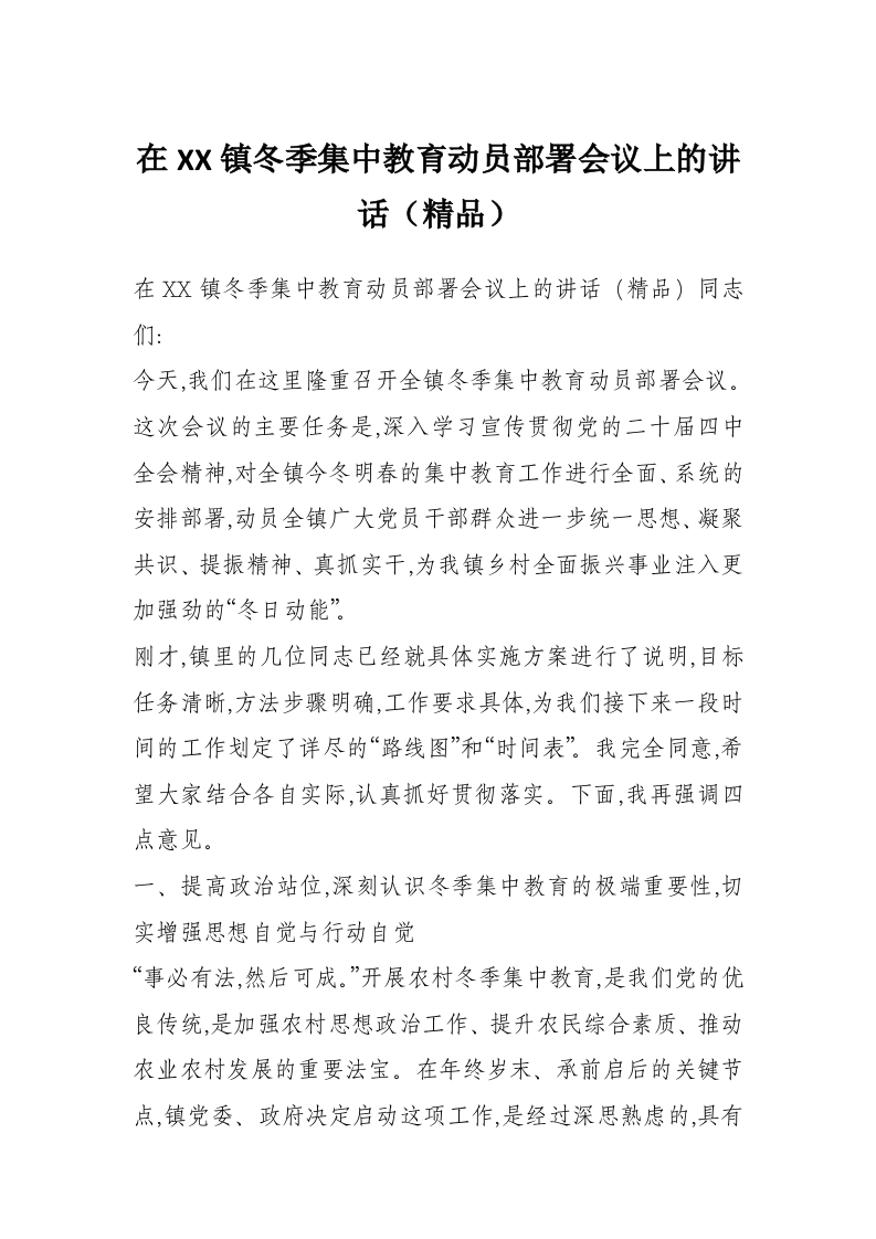 首页学习提升在XX镇冬季集中教育动员部署会议上的讲话(精品)